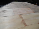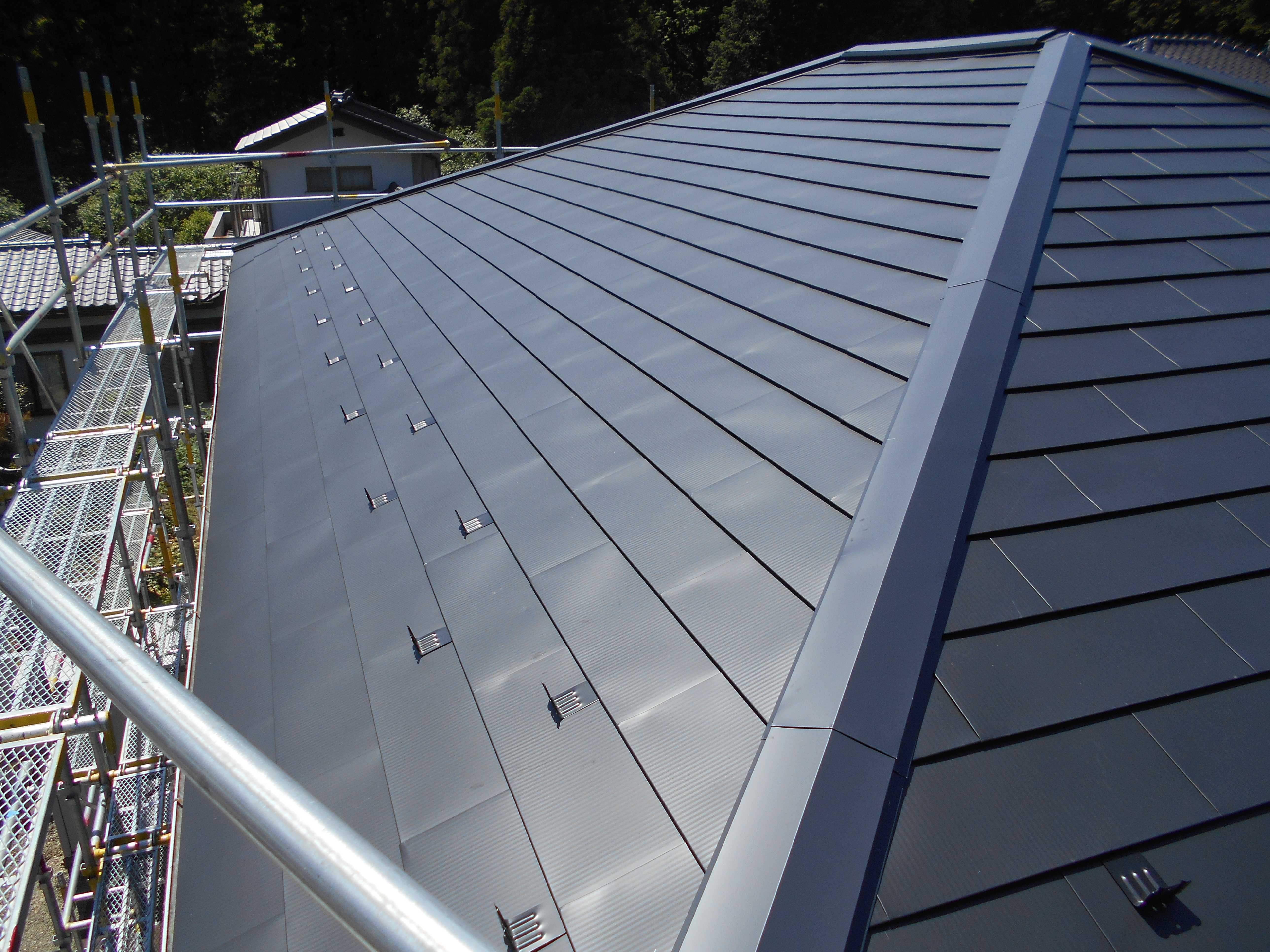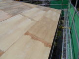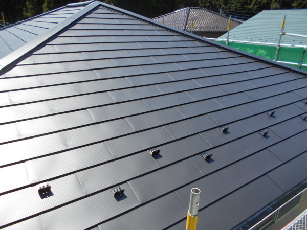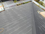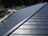 雨漏りが原因で北側の屋根の下地が腐食してしまい歩くとフワフワする状態でした。雨漏りの水は止められても下地の交換となると大掛かりな工事になってしまいます。そこで今回の工事を提案させていただきました。既存の屋根を壊さないので手間も処分費も削減出来ます。既存屋根の上に新しくベニヤ下地を作り、そこにガムロンシート(ベタベタするガムみたいな防水シート)をキレイに貼ってその上にガルバリュウム鋼板製の新しい屋根を葺かせていただきました。